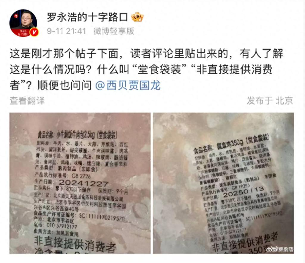 9月11日晚间,罗永浩微博贴出两张网友提供的图片,其中显示为堂食袋装的焖饭牛肉包和椒麻鸡。不少网友评价,这不就是大众所认知的预制菜?也有网友称,西贝这是钻了国标预制菜定义的空子。