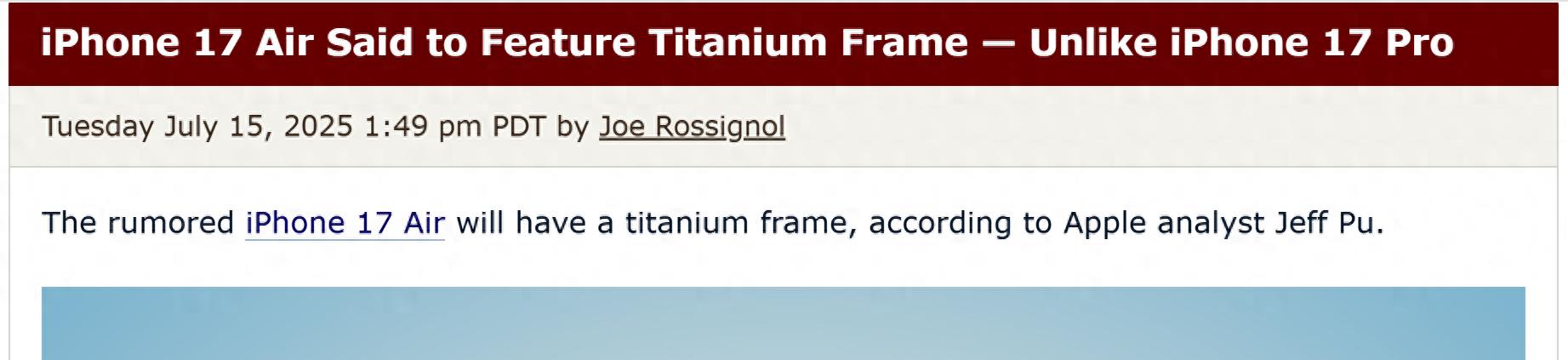 iPhone 17系列中框材质差异化 分析师:Air机型将首用钛合金材质