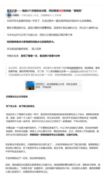 另一方面,他们盘踞在“你们找的情感挽回机构真的有用吗?”、“如何在出轨后修复感情”等问题下方,一边在众多的回答、回复中寻找客户,一边自己下场,编造出感情破损的悲惨经历,然后剖析心路历程,是如何在情感导师的帮助下,一步步的挽回的,最后艾特出自己的情感导师,来为其引流。