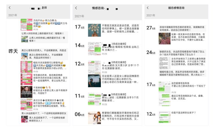 “挽回前任,原地结婚”、“分离小三,替你分忧”、“情感挽回率达98%”、“最快一天,最慢10天即可修复感情”、“快速挽回伴侣的五项技能”、“掌握四大技巧就能修复感情”。