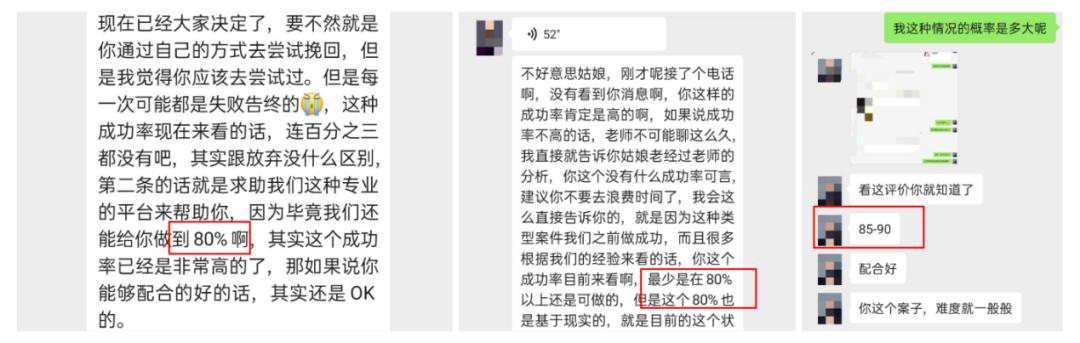 由上图可见,展示自己的成功率极为常见。三位导师描述的分别是在80%、80%以上和85%—90%之间,假设客户真实存在感情问题,在这样的数字诱惑下,又有几人能否忍住不付费。