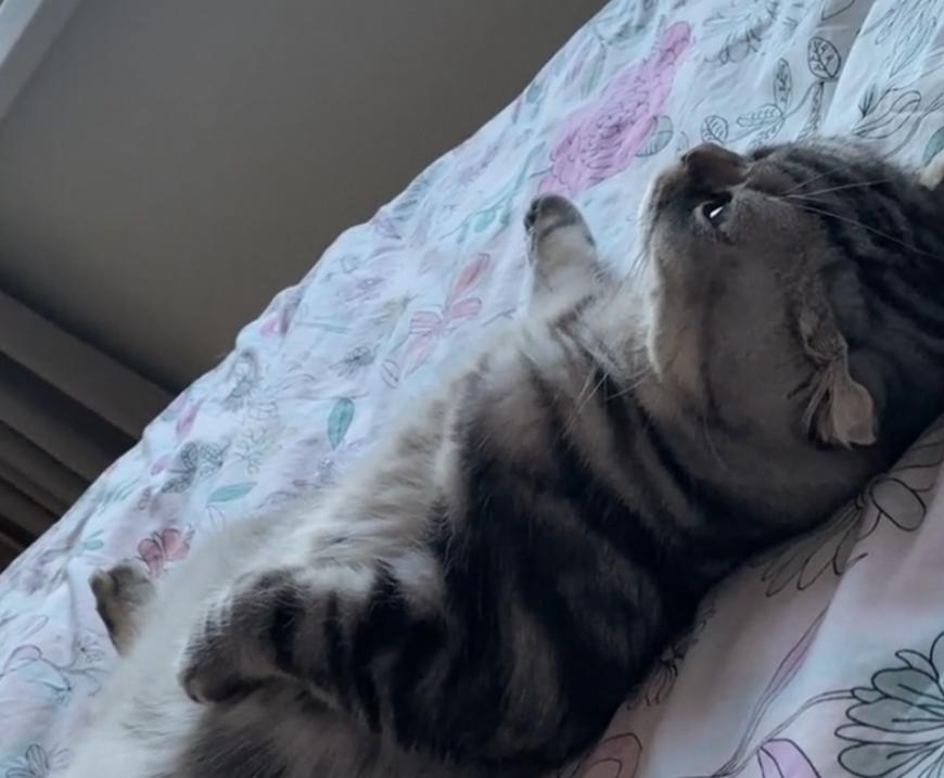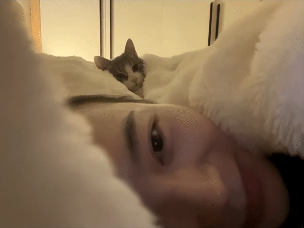 下一秒,猫就在旁边躺下了,甚至它还盖着被子,靠着枕头,活脱脱就像个人。