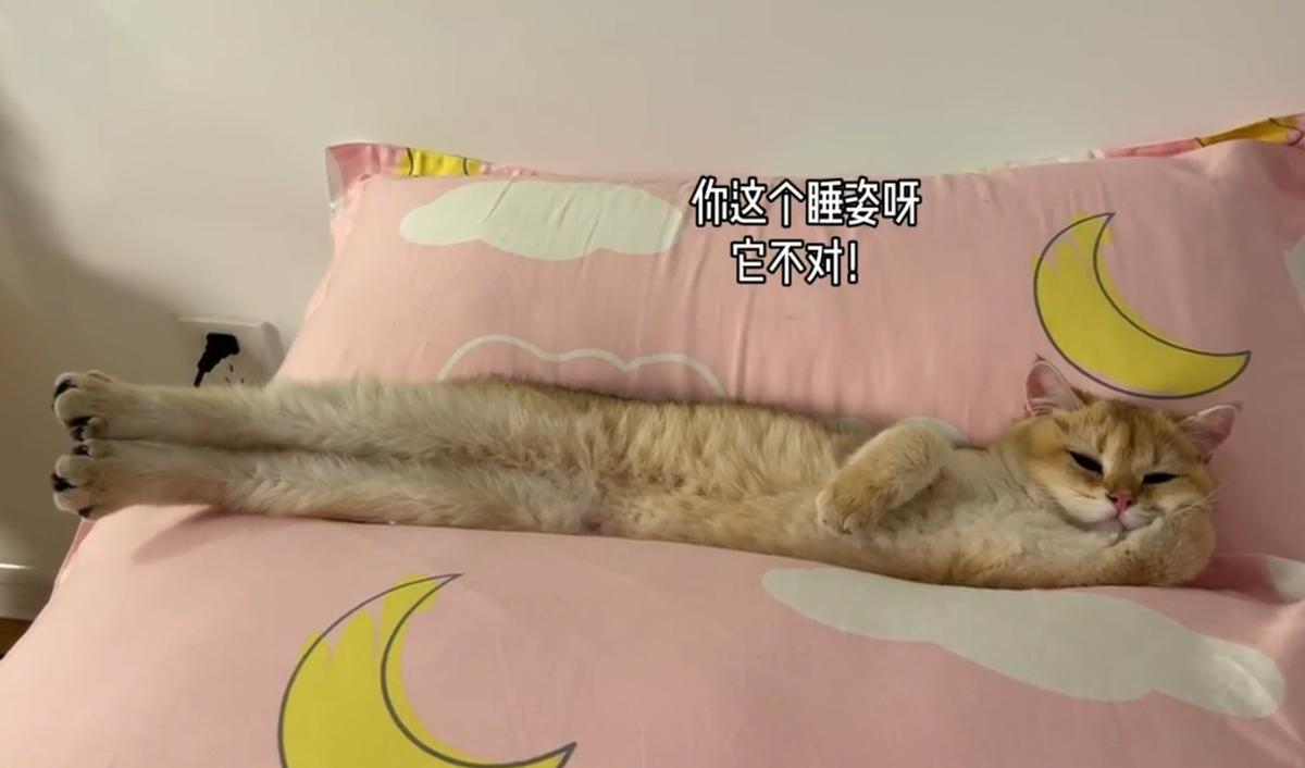 猫躺在一动不动,睡姿非常标准,但仔细一看,眼睛瞪得溜圆,根本就无心睡觉。