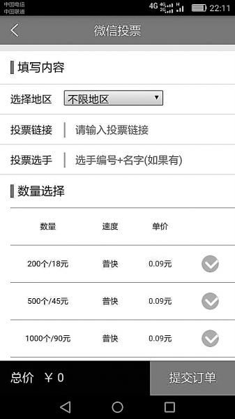 3.打开首页,里面显示了微信投票,可以选择地区、投票链接、投票选手(选手名字加编号)。