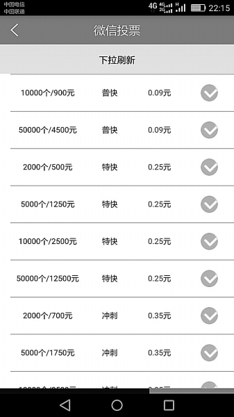 4.记者注意到,投票分为“普快、特快、冲刺”三个阶段,普快9分钱一票,特快2角5分一票,而冲刺则3角5分一票。普快范围内,在数量选择上,最便宜的18元200票,最贵的4500元5万票。