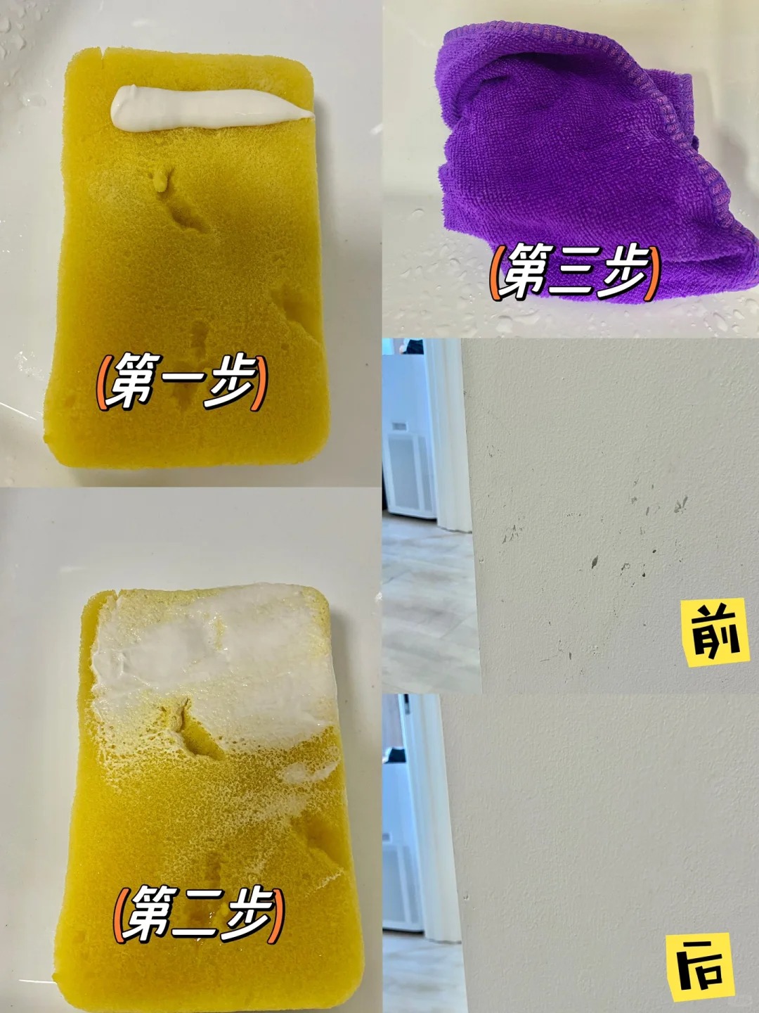 牙膏+干净的洗碗海绵擦,能除掉大部分的墙面污垢。