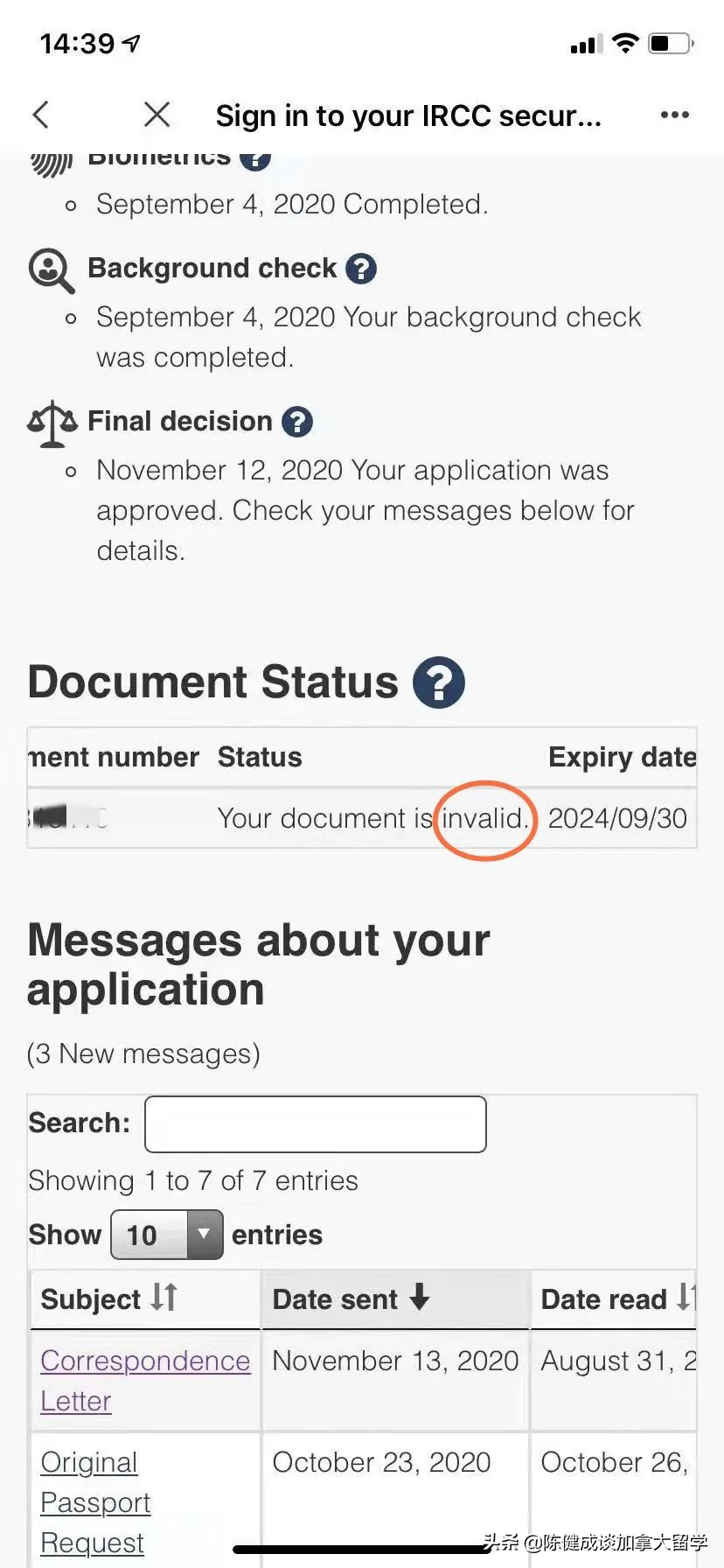 后来我问清楚家长,学生是在8月24日去加拿大体检中心体检,而体检中心也回复8月26日向“系统”提交了体检结果(注意是“系统”而不是移民局),所以,我理解,这位孩子被我们这边工作人员拒绝离境,是由于体检后结果,可能未到加拿大移民移民局系统,而只是到了加拿大医务官那里,所以,在移民局系统显示他文件中的体检文件可能处于(invalid)无效状态,而工作人员进而判断他签证也处于无效。而这个状态,我们离境人员可能担心学生到加拿大不能入境而被遭到原机返回。这也是一番好意!