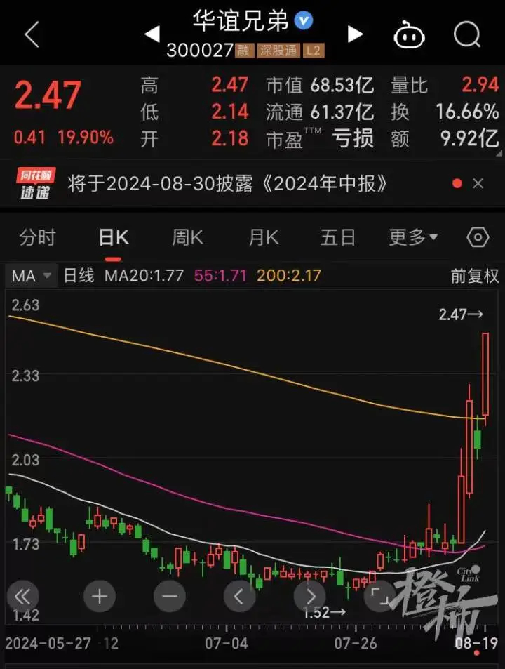 《黑神话:悟空》火爆出圈,资本市场相关概念股的股价也是水涨船高,其中,与这款游戏密切相关的华谊兄弟,今日强势20%涨停。8月14日以来,累计涨幅高达43%。