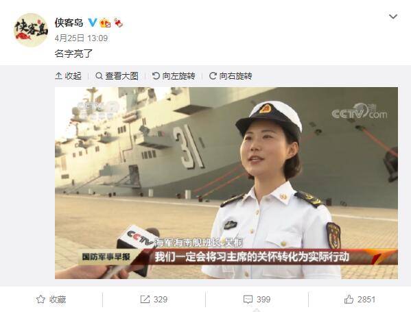 4月23日,在人民海军成立72周年的这一天,解放军海军长征18号艇、大连舰、海南舰三型主战舰艇在海南三亚某军港集中交接入列。同一天一次性入列三艘主战舰艇,备受瞩目。与此同时,在央视国防军事的相关采访报道中,一位名叫吴桐的海南舰女班长接受采访。节目一播出,这位女班长因其名字谐音“武统”而意外走红,引发网友热议。