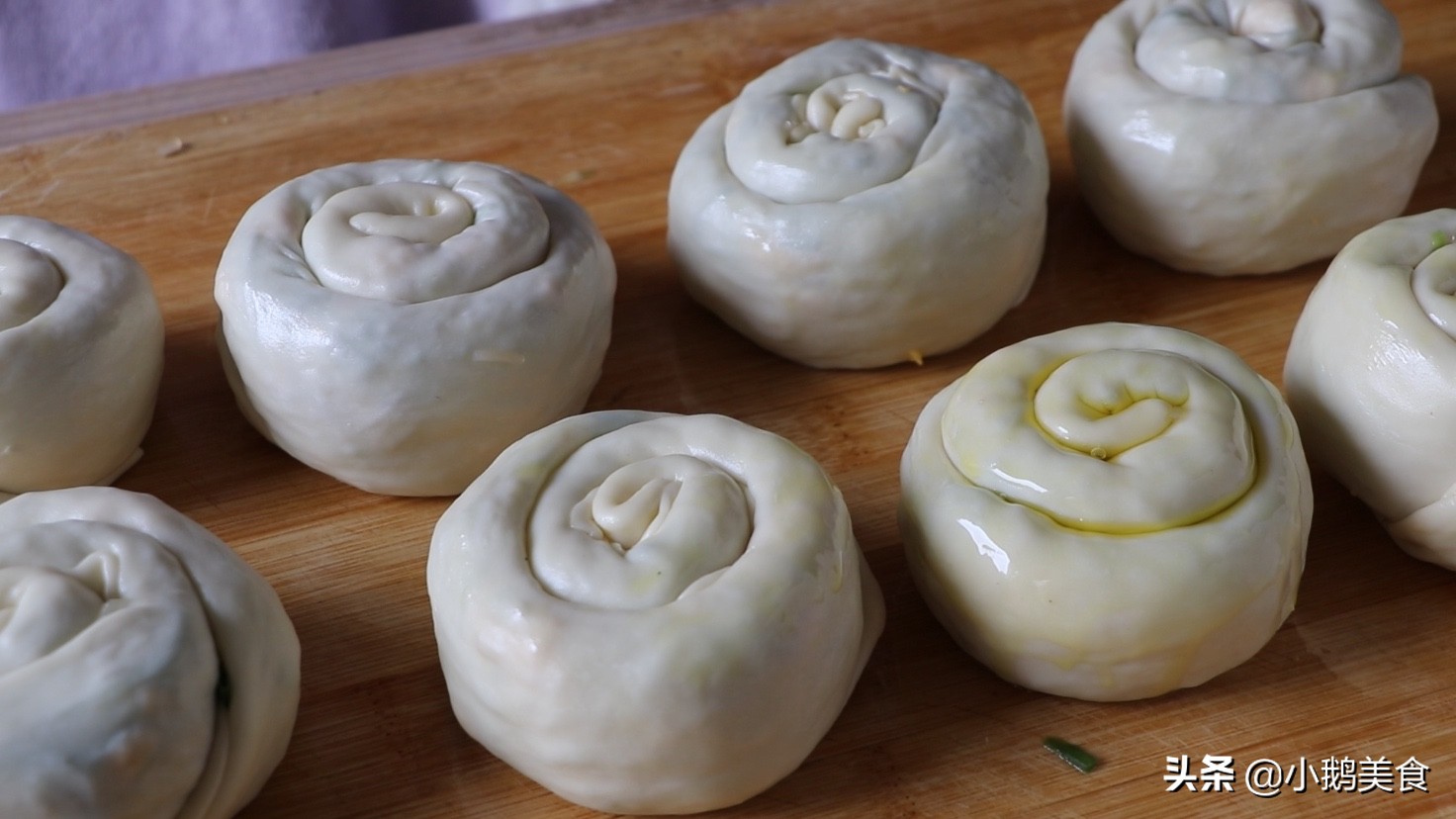 2、揉光滑后,搓成条切成8个剂子,每个剂子再揉光滑,搓成条,抹上一层食用油,放在盘子里,盖上保鲜膜,饧面40分钟。面要饧到位,才更有弹性,更易操作。