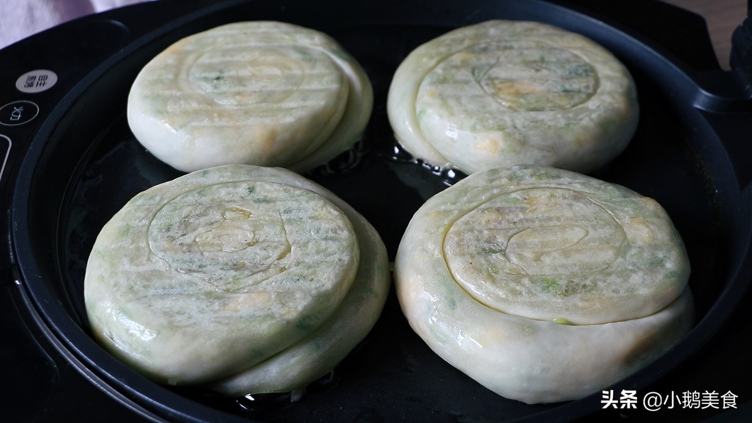 8、中火烙,大约1分钟翻一次面,反复多次翻面,烙到饼子两面金黄,按压可以快速回弹就熟透了。一锅饼大概6到8分钟。