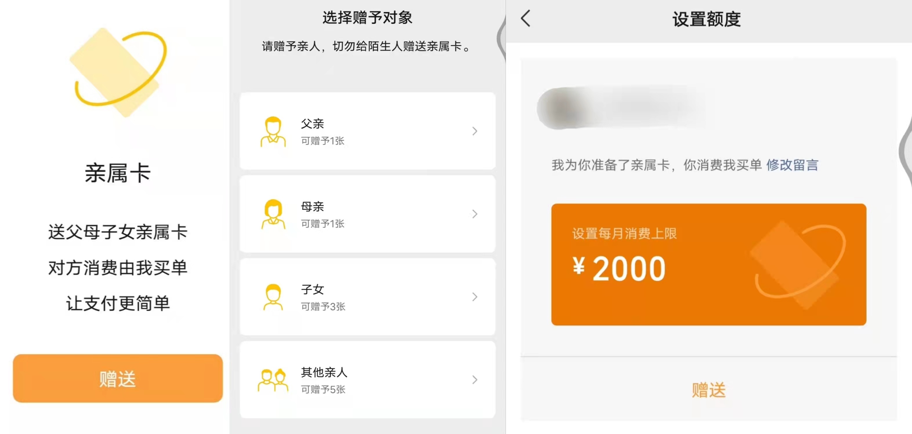 进入好友列表找到他,之后设置每月消费上限,输入密码后确认赠送,亲属便可在手机上查看信息,领取亲属卡。