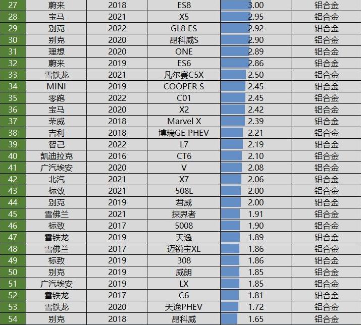 再来看看后防撞梁为铝合金的车型第27-54名:这些车型后后防撞梁的厚度都在3毫米以下了,其中宝马X5、AION LX、蔚来ES6、凯迪拉克CT6/理想ONE和别克GL8 E等一些豪华车型,后防撞梁的厚度,相比它们的售价就显得有点小气了。而别克威朗、标致308和雪佛兰迈锐宝xl等一些低价车型,后防撞梁也能用上铝合金的,表现值得赞扬!