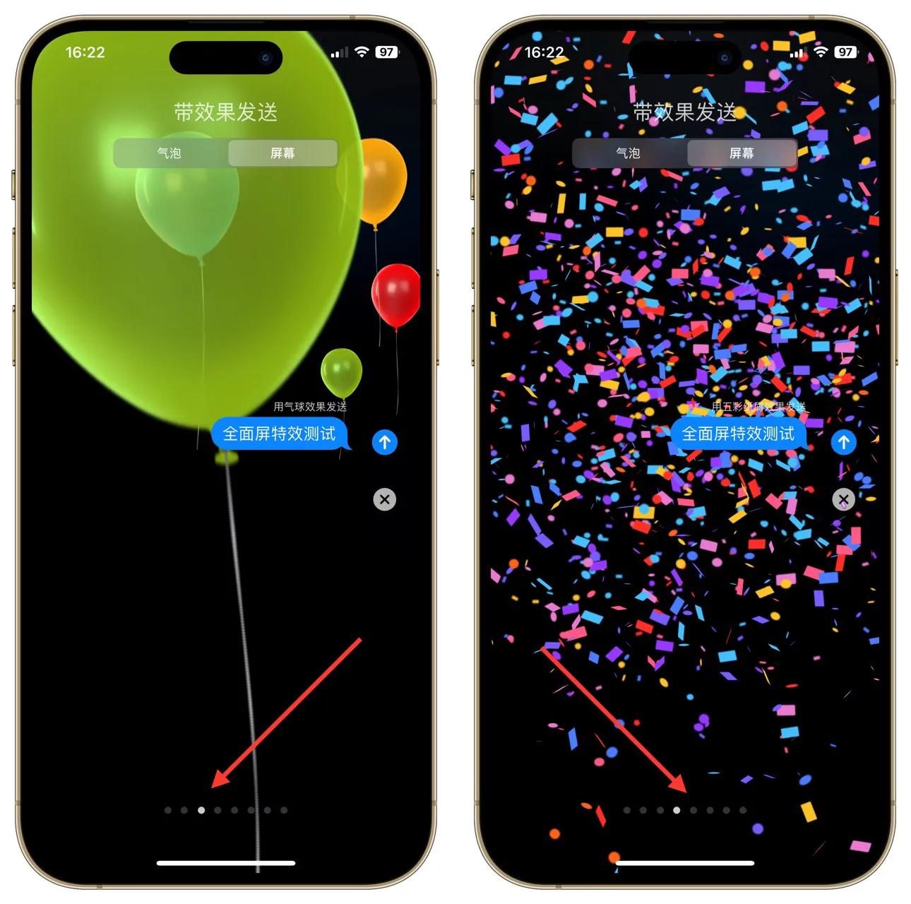 除了在发送内容上添加特效,还可以在全屏幕添加特效,输入内容先不要点击发送,长按住发送箭头,出现添加特效页面,然后点击顶端的“页面”,就进入了全屏特效选择页面了。