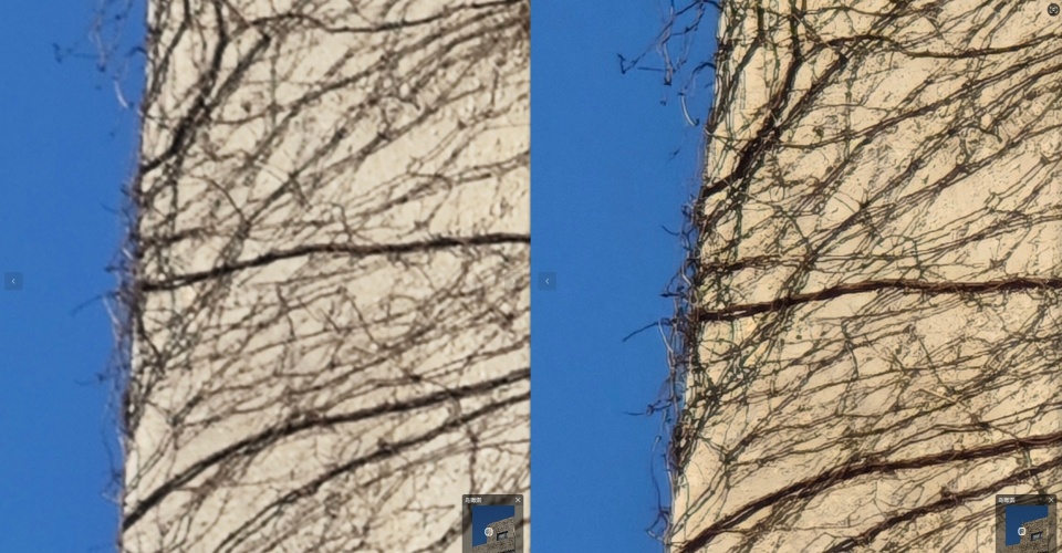 此外,左上角的树叶阴影处也有显著差异,小米15不管是对比度还是细节表现都明显更胜一筹,但是小米14也并非没有优点,叶片上的绿斑得到了更好的还原,小米15的算法为了让整体色彩更统一,压低了绿色的占比,也导致了一些色彩细节的丢失。