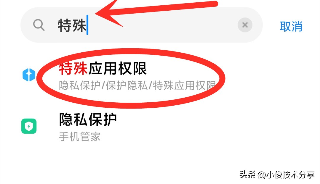 那手机之所以会在我们不知不觉中,偷偷下载安装软件,主要是由于一个开关没有关闭导致的,此时我们打开手机设置,接着在最上面的搜索框中输入【特殊权限】这4个字,然后选择【特殊应用权限】