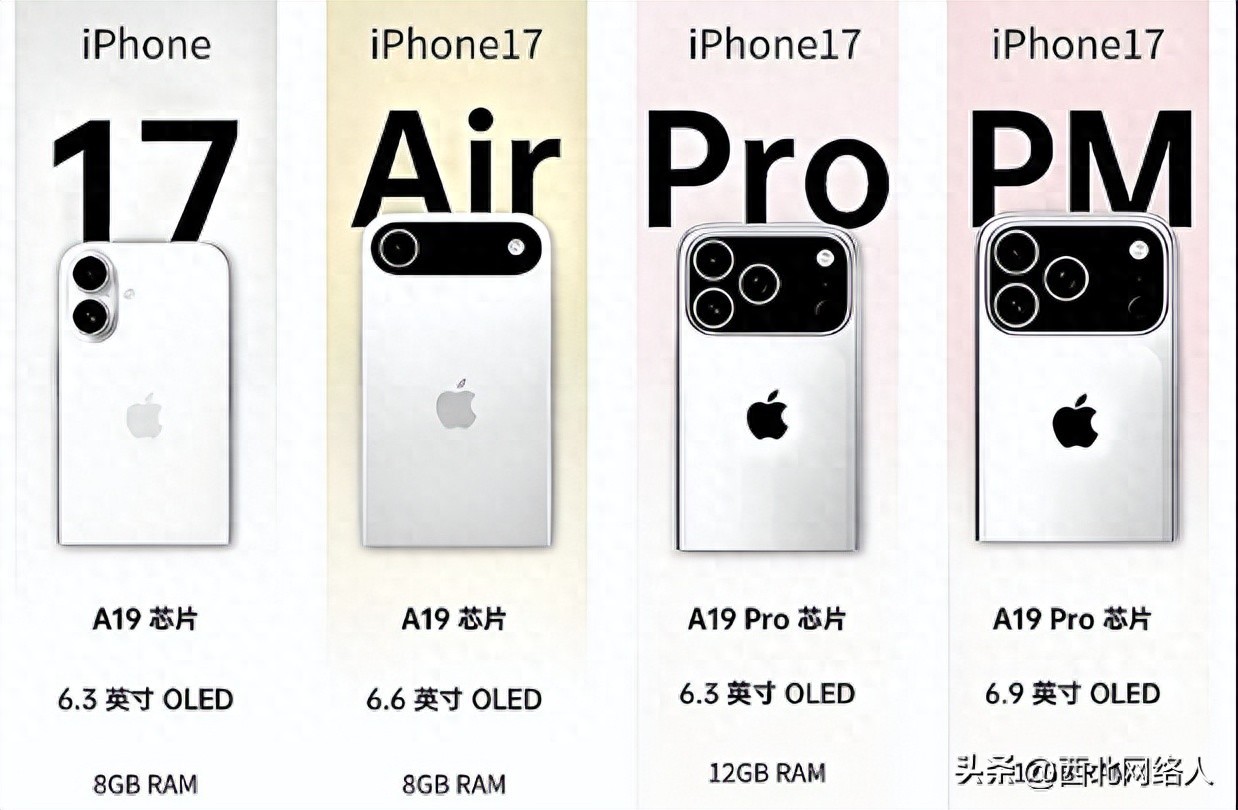 iPhone17系列四款机型拉开明显价差:标准版延续iPhone16设计,6.27英寸屏+双摄定价或维持5999元起;Air机型凭借钛金属机身和12GB内存,可能创造苹果最薄溢价,预计7499元起跳;Pro系列因Wi-Fi7芯片和8K视频录制,大概率突破万元心理线,Max版本或达12999元。
