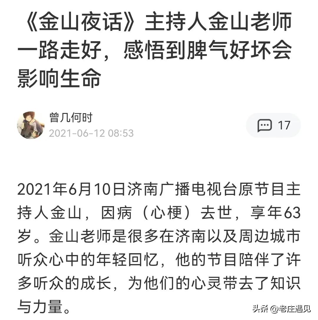 陪伴成长的金山老师也就承担着这样的社会责任,也就是陪伴折腾,或许这就是金山老师不得不退休的原因,并且很快就远离这个他关爱关怀的世界。在节目中,听众的“事故现场”或“事件频发”心理压力逐渐悄悄侵蚀了强大心脏的金山老师身体,随着节目周期拉长年龄的增长,健康系统或许已经在节目停播前就被动“停播”了,金山老师退休二年后,2021年6月10日因为心肌梗塞去世了。