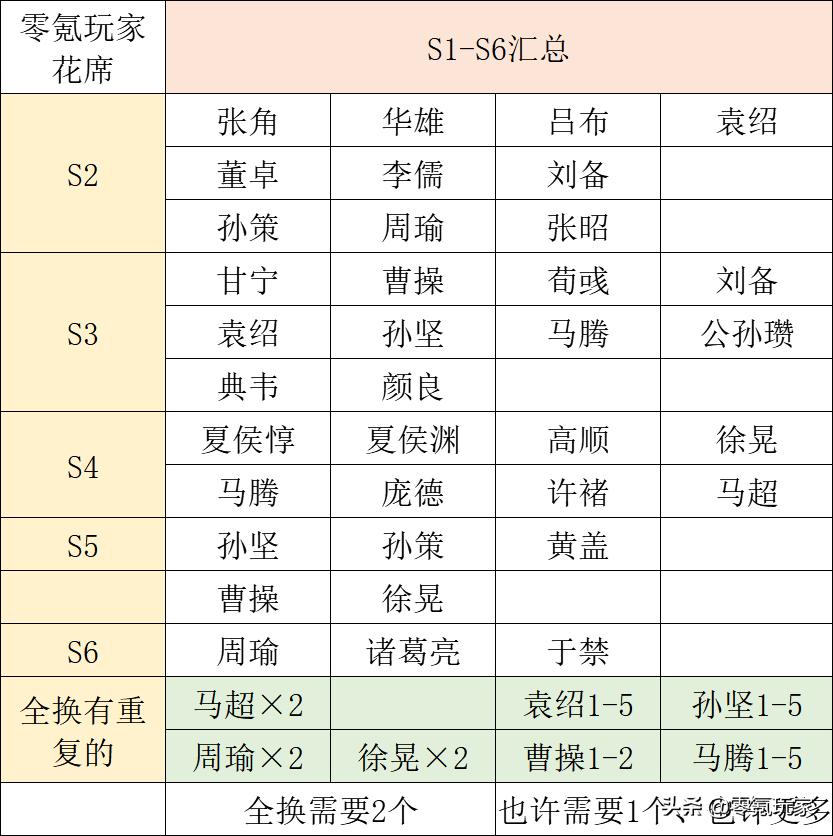 上面按照每个赛季汇总了一遍,下面是需要2个武将的,曹操、袁绍、孙坚、马腾因为三势阵的存在,也许一个就够、也许需要5个。