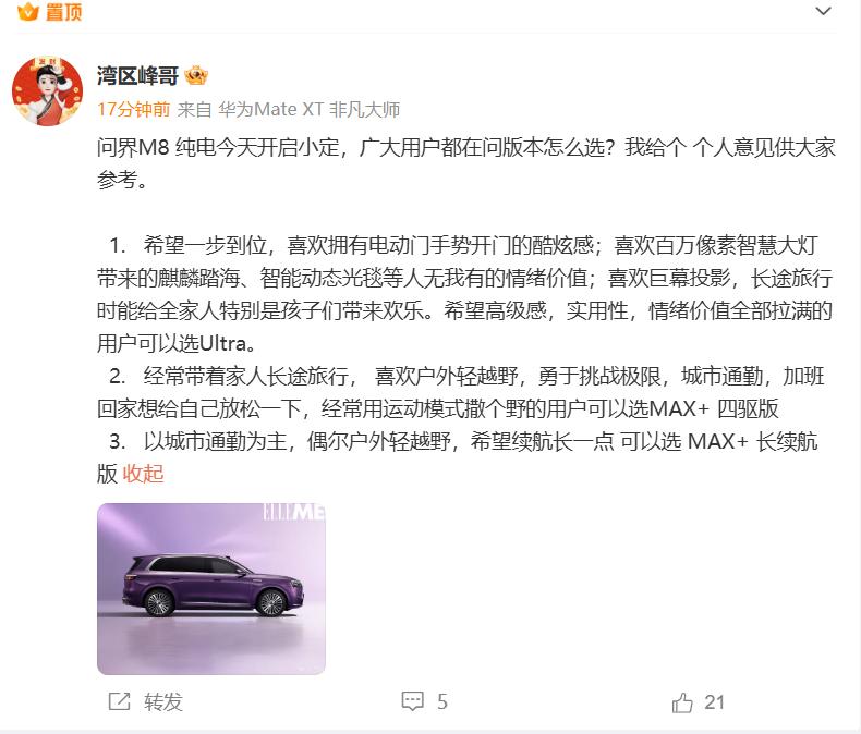 值得注意的是,7月25日,问界M8产品经理@湾区峰哥发文:问界M8 纯电今天开启小定,广大用户都在问版本怎么选?我给个 个人意见供大家参考。