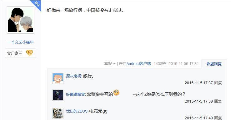 “一个文艺的小骚年”最后一次更新帖子定格在2015年11月21日晚上19点21分,“秋季赛打完了吗”,他迫切的问道。在此之后,他从网络上消失了,仿佛从来没有来过这里似的。