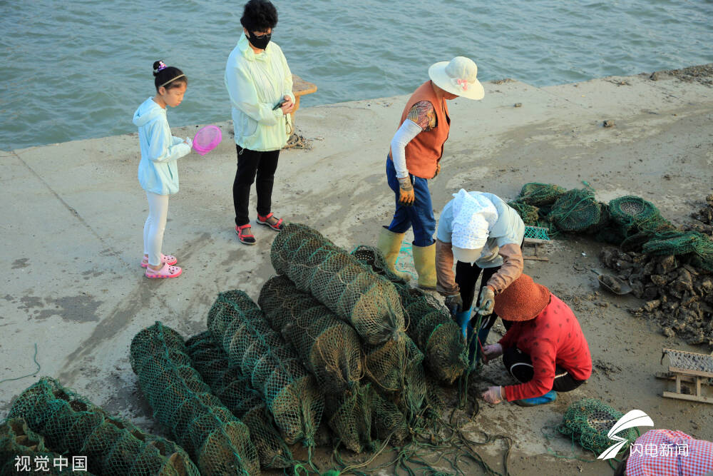 7月3日,清晨六点的日照市任家台渔码头,渔民们正在将刚上岸的牡蛎进行分苗。游客们实地围观,亲眼观看海鲜原产地的劳动情景。