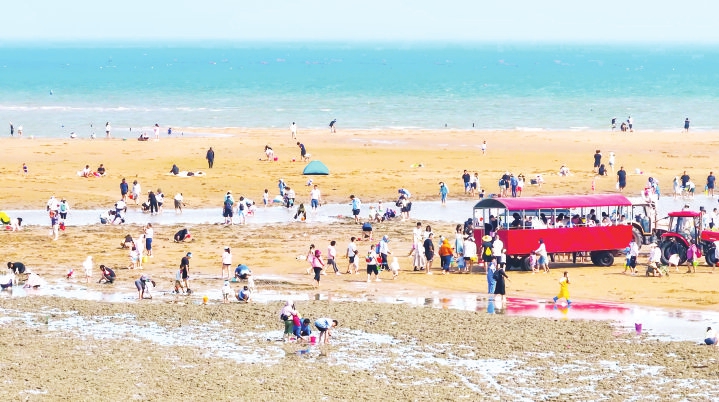 近日,在位于日照市东港区的刘家湾赶海园,游客趁着落潮前来赶海拾贝、休闲消夏。