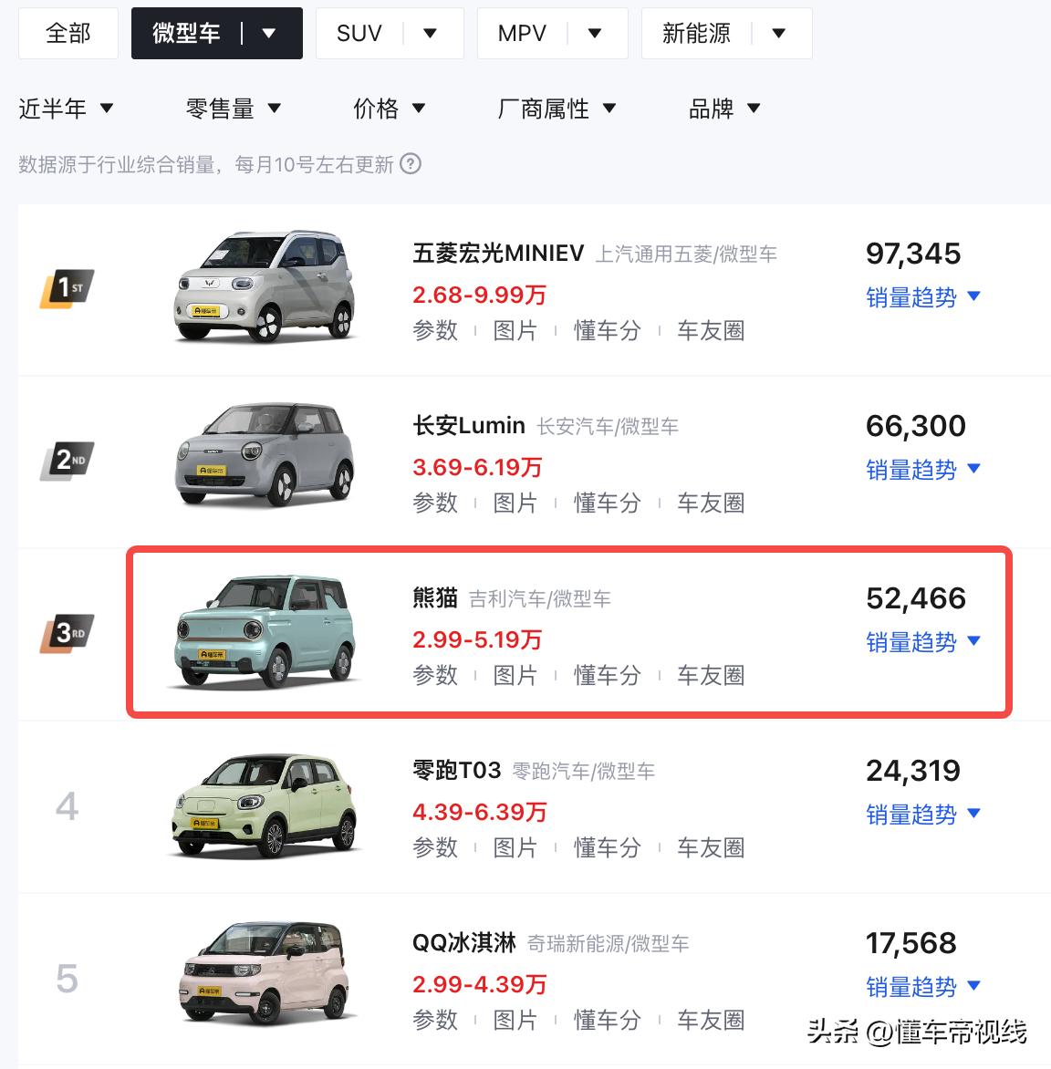 从近半年销量看,吉利熊猫售出52466辆,在国内微型车销量榜排名第3位,仅次于五菱宏光MINIEV(指导价3.28万-9.99万元)、长安Lumin(指导价3.79万-6.99万元),但要领先于零跑T03(指导价4.99万-6.99万元)、奇瑞QQ冰淇淋(指导价2.99万-5.69万元)等产品。此次该车推出2025款车型,能否进一步提升市场表现,我们拭目以待。