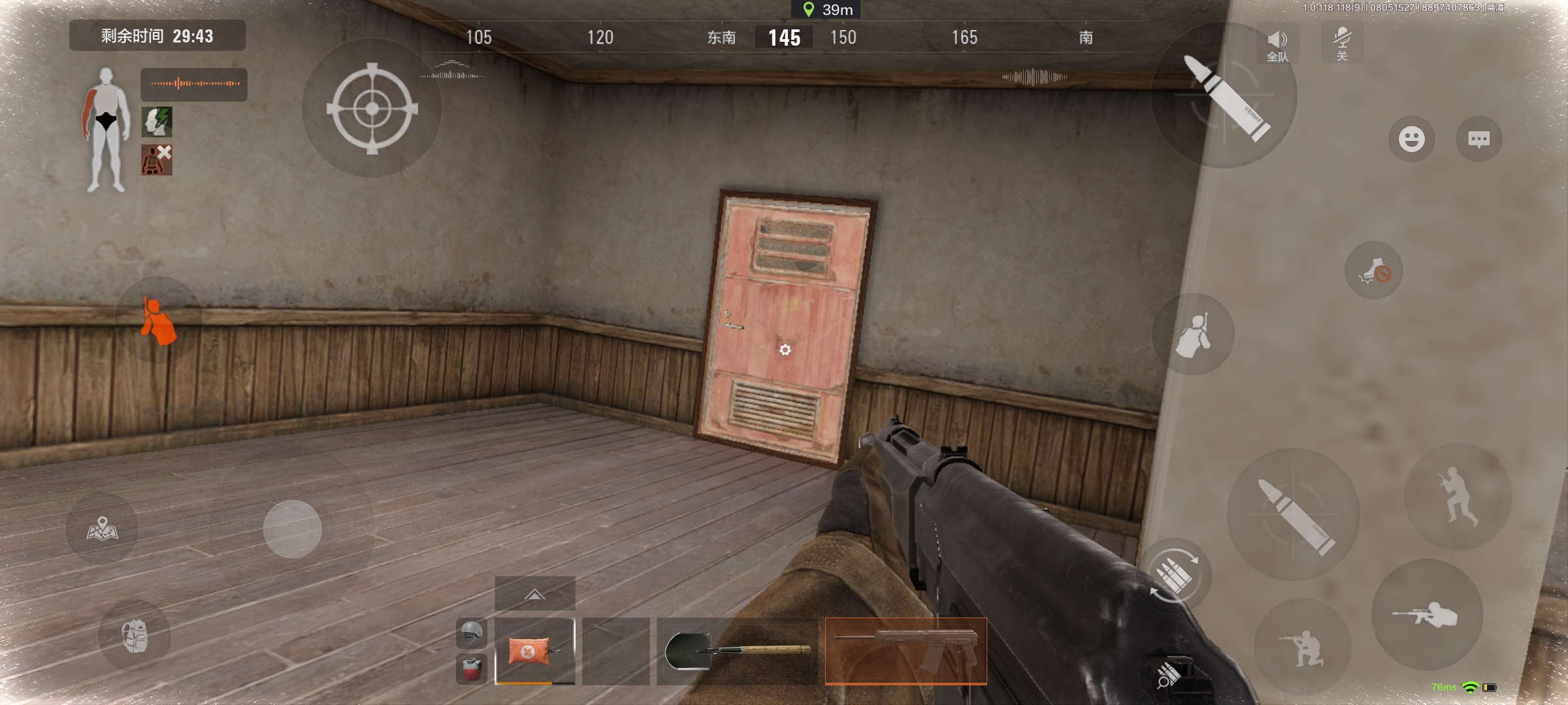 走地下室开启这个红门的时候,开了往边上躲,探头或者扔雷看看有没有人(如下图)。要不然就像我这样子蹲在这里,冲进来一个我一喷就死。红门里面所有的小房间都有可能有老六,所以需要格外小心房间角落。