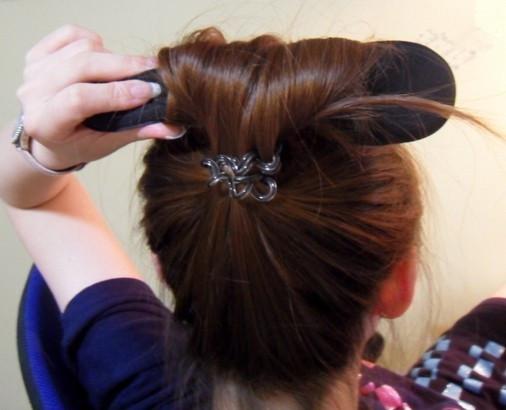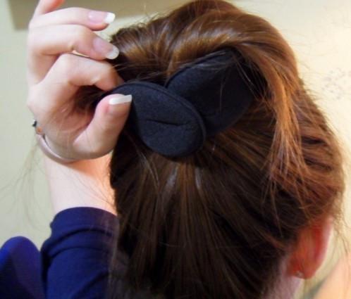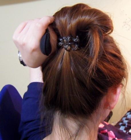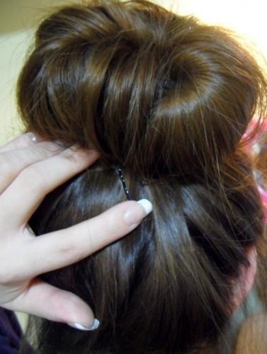 把绑起来的发束分成两个部分。用其中的一份朝向一个方向卷,绕着辫子根部卷花苞,一边卷一边用夹子固定。