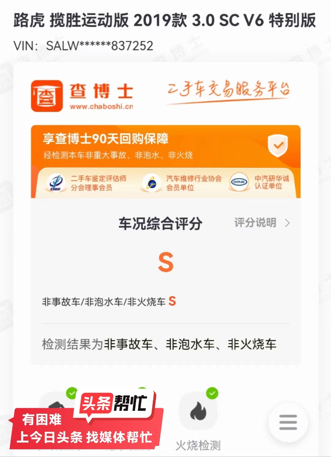 近日,长沙市民郑先生通过今日头条“头条帮忙”长沙频道向晨意帮忙记者求助称:他是长沙一家车行的员工,最近店里收购了一台路虎揽胜运动版SUV,收车前,对方提供了查博士的鉴定报告,报告显示该车“非事故车、非泡水车、非火烧车”。基于对检测报告的信任,郑先生买下这台车,并以63万多元、非事故车的价格卖给了客户易先生。