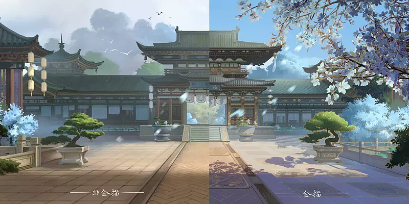另一方面项目组还希望进一步突出华贵的特点,于是游戏从非遗工艺——墨彩描金上获得了灵感,选择了在画面创作中融入描金技艺。这种画法对线条的疏密、虚实都有讲究,无法用电脑直接渲染,制作团队需要在学习之后亲手绘画,也使得每幅画稿的完成时间至少需要多花两周。