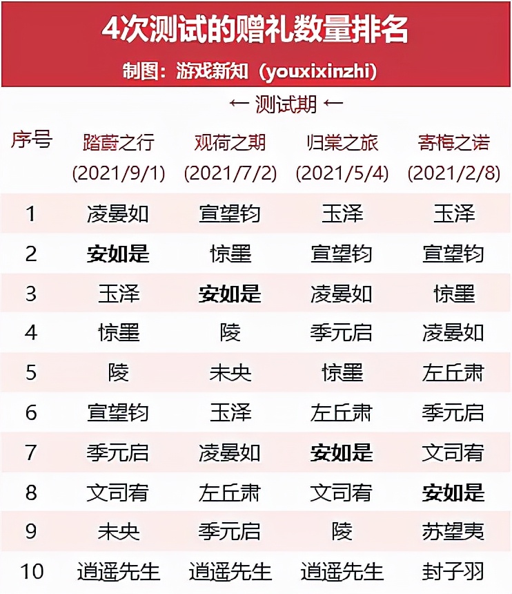 根据官方在TapTap发布的统计数据,从游戏今年进行的四次测试中,可以通过赠礼情况的排名看出玩家对哪种类型的人物更有好感。像季元启这样大大咧咧的阳光男生、玉泽这样温文尔雅的老师,以及知书达理的大家闺秀未央,都名列前茅。