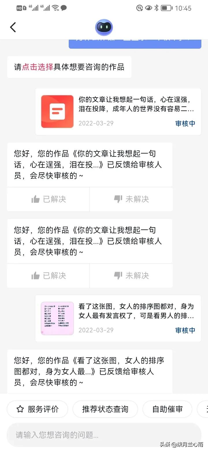 经过这一番操作,一直正在审核中的作品有两个秒过,所以遇到这种长时间审核不通过的,一定要按照上面的方法,自己去找客服解决,不能一直等,毕竟是自己辛辛苦苦的创作,以前遇到这样的问题,我一般就选择了默默删除作品,觉得这样一直审核不通过的展现量也一定不会很高,今天看到自己的信用分没问题,还有就是想起一句话,办法总比困难多!所以尝试了一下自己解决问题!