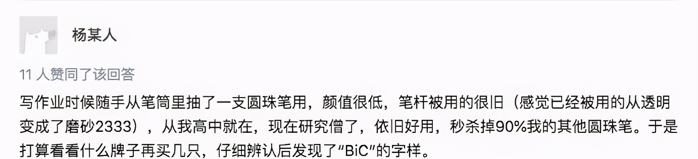 关于 BiC 这支圆珠笔,网友给出成千上万个花样答案,大部分都是「上高数只带它」、「陪伴童年」、「不断水能用很久」。