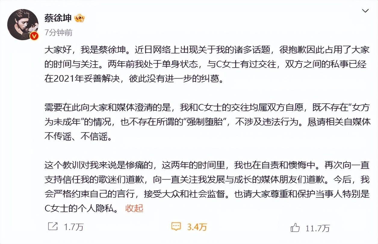 7月3日,蔡徐坤发文回应玩一夜情致女方怀孕堕胎的传闻,称与女方有过交往,双方之间的私事已经在2021年妥善解决,彼此没有进一步的纠葛。