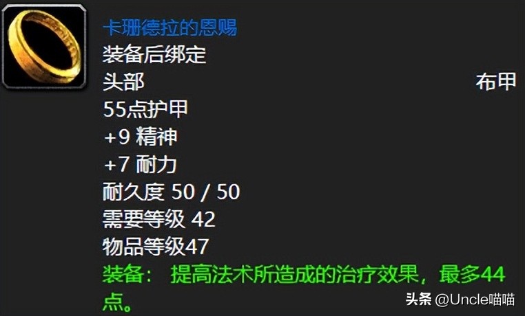 世界掉落的装绑头部装备卡珊德拉的恩赐,真的是不挑人的存在,只要是个玩家无脑花上几个金币入坑即可,虽然物品等级看着只有47级,而且42级就可以佩戴,但是它确确实实是60级初期团本前最实在的治疗头了,44点的治疗效果提高真的无话可说。