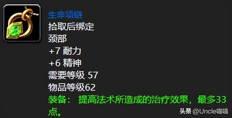 首先隆重出场的就是我们斯坦索姆吞咽者拉姆斯登的生命项链,蓝色品种紫色水准的它可是前期治疗无脑肝的存在,33点的治疗效果提高必然恐怖如斯,而且还有耐力和精神扶持,拥有它基本上就等换金度的邪眼都没有任何问题。不过东西是好东西,我奶德和牧师每天肝一次硬生生没遇见过,你敢信!