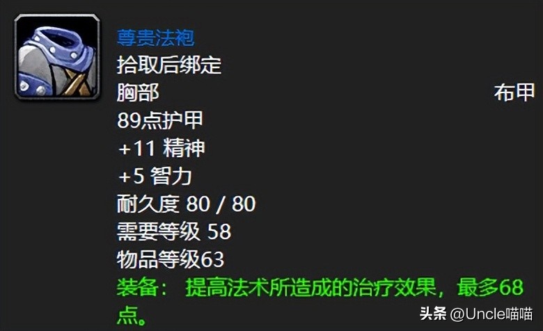 谈及斯坦索姆,除了生命项链极品到无可言喻,还有我们瑞文戴尔男爵的尊贵法袍,这东西除了没有耐力之外,几乎是看不出任何缺点,如果再给加上耐力,就冲着这68点治疗链你遨游前三个阶段都没问题,当然前提是你不在乎它这蓝色品质。这东西的掉率相较于生命项链还是可观多了,起码茁壮的喵叔曾经有幸拥有过。