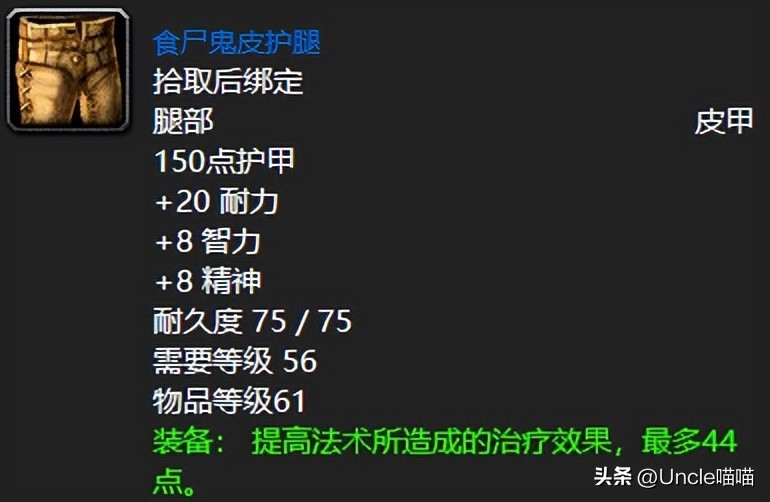 聊来聊去,终于又到了我大德鲁伊的主场了,这款通灵学院六大学者共享掉落的食尸鬼皮护腿,真真是我们奶德最爱,设计师也是懂我们的皮糙肉厚啊,硬生生的给安排了20点的耐力,堪称恐怖如斯。不过正是因为过分的优秀,所有很多奶萨也一般穿戴着他。