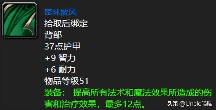 辛特兰经典任务“海克斯与其爪牙”奖励的密林披风,绝大多数治疗玩家应该是直挺挺的带进熔火之心才能卸下来了吧,必肝存在。虽然说12点治疗效果有那么一丢丢不尽人意,但是好在智耐比较高,所以也是极具性价比的存在,再者基本上这东西51级你就能组队肝到手,一路驰骋到60初期你还能要求啥呢?