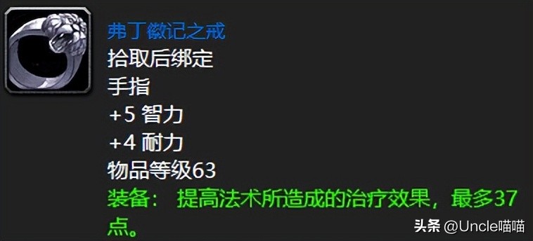 如果说红木之环你硬要必须伤肝的话,那么此款弗丁徽记之戒就是简单易肝的神级戒指了。西瘟疫之地经典任务“在梦中”奖励,治疗玩家无论如何都必须打卡存在,毕竟37点治疗效果搭配智耐的弗丁徽记之戒真的已经隐隐间有着撼动灼烧指环的实力了,你就算是躺进黑翼之巢也没人会小觑它的存在,很不客气的说,这应该是一般性治疗玩家使用过最长时间线的装备之一。
