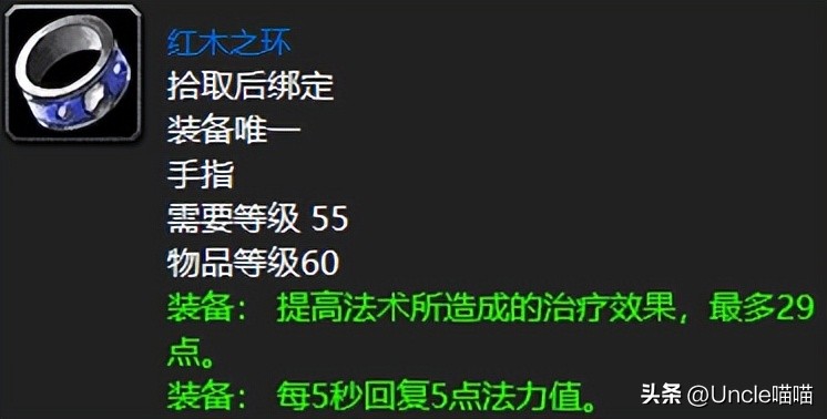 黑石塔乌洛克的红木之环,必然是治疗玩家的典藏版情怀记忆了。虽然没有智耐精加持,但是五回和29点治疗效果真的足以让你带上很久,不过就是黑下也不是人去的地方啊,小怪多不说,副本还设计的超级大,要不是高图斯的命令必须打卡一次,真的是不愿意去啊,只能祈祷能够一发入魂美滋滋了!