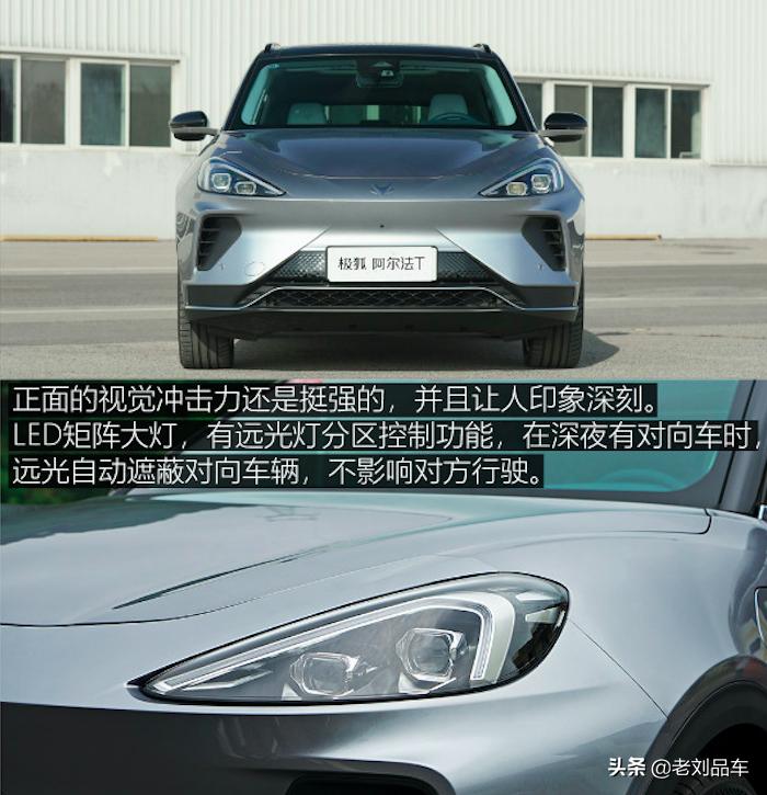今天给大家介绍的是极狐阿尔法T(ARCFOX aT)纯电动SUV车型,前脸造型中间是个非常有特色的“极狐”车标,看着很像个小狐狸。机盖上方的两条筋线,再配合下进气两侧的线条,组成了一个大大的“X”形,这就是极狐家族全新的设计语言。车头两侧是标配的LED大灯,下方保险杠两侧做了导流槽的设计,真的是可以透风导流,配合上底部一根贯穿式的镀铬条,整个前脸显得特别精致。