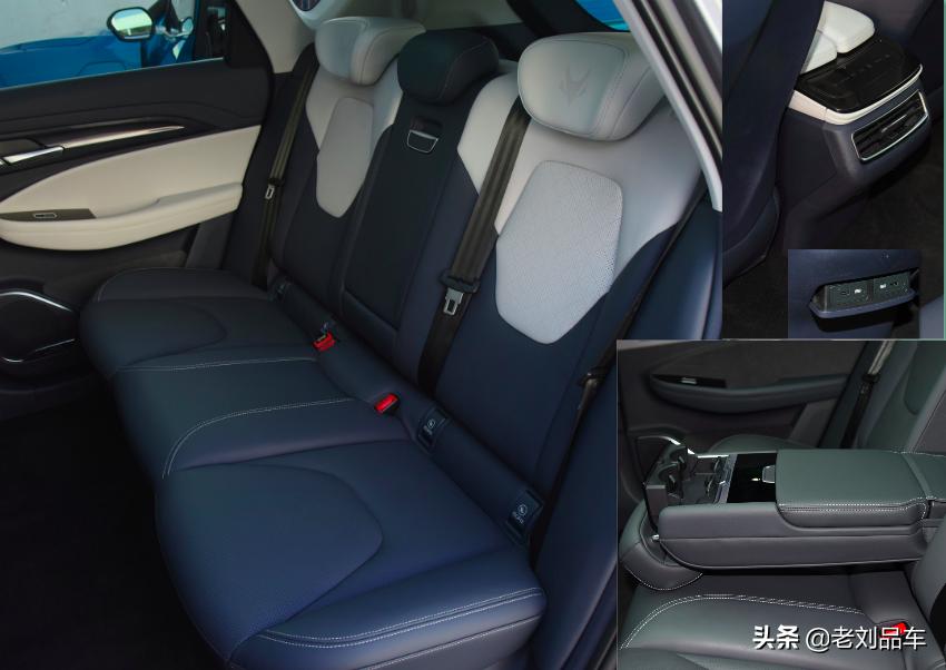 后排空间特别大,前排座椅调整好驾驶位置,腿部有三拳多的距离,头部富余一拳;整个地台呈纯平的状态,后排坐三个人一点问题都没有。配置方面有空调出风口以及两个USB充电接口,上面有个小的触控屏,可以控制前排多媒体音量和吹风角度。后排座椅的填充物柔软,靠背和头枕也非常舒服;中间扶手箱有个带盖子的储物盒以及两个杯架。车门板上的储物槽里都用植绒材料做了包裹,放东西也不会出现声音。这台车配备的是燕飞利仕音响,播放音乐的效果也非常动听。