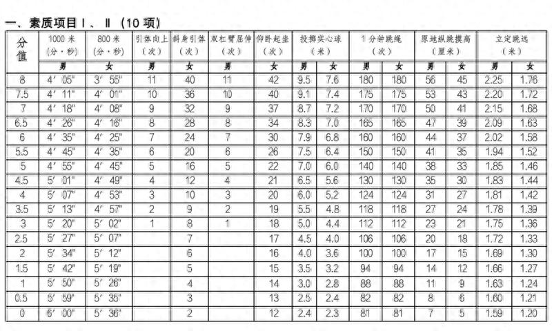 北京市义务教育体育与健康考核评价现场考试项目评分标准