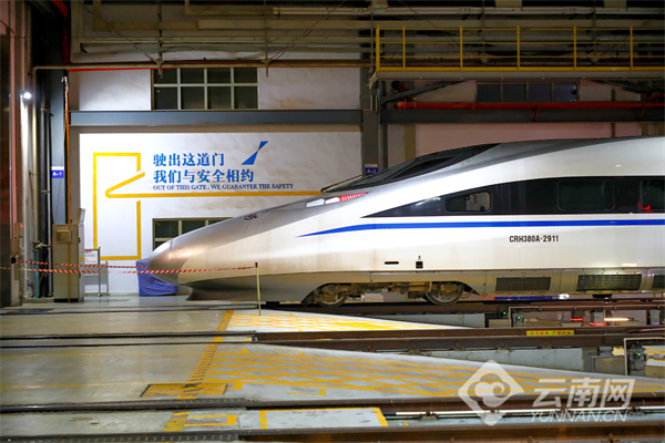 昆明车辆段每晚有400余名动车组机械师在岗,通宵达旦地对从全国各地“赶回”昆明的动车组进行“全身体检”。对走行部、制动装置、电气设备等重点关键部位进行全面深入检修,确保天明后动车组迎着清晨第一缕阳光“健康”上线。