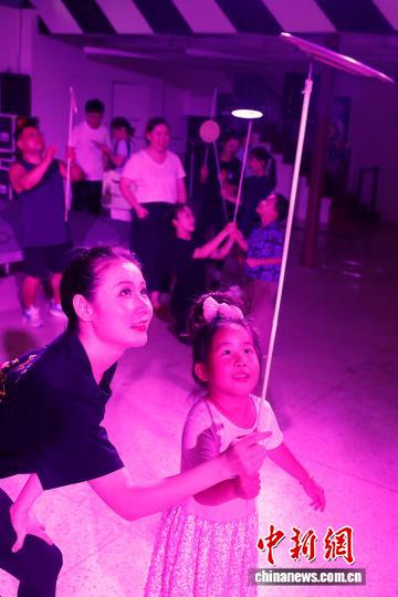 7月20日,孩子在演员的帮助下学习转碟。当日,由杭州杂技总团演艺有限公司和上海荣誉文化传播有限公司联袂制作的中国首部沉浸式杂技《满满的豆子Full of Beans——浸入杂技》在上海市长宁区延安西路1262号上生·新所海军俱乐部上演。在整个演出中观众不仅能零距离亲近演员,还能参与互动,并亲身体验杂技的艰辛与魅力。中新社记者 殷立勤 摄
