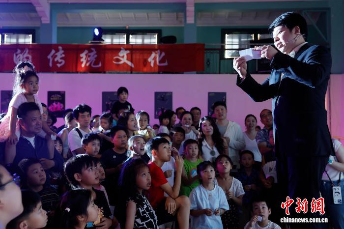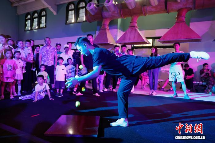 7月20日,演员讲解魔术表演时的技巧。当日,由杭州杂技总团演艺有限公司和上海荣誉文化传播有限公司联袂制作的中国首部沉浸式杂技《满满的豆子Full of Beans——浸入杂技》在上海市长宁区延安西路1262号上生·新所海军俱乐部上演。在整个演出中观众不仅能零距离亲近演员,还能参与互动,并亲身体验杂技的艰辛与魅力。中新社记者 殷立勤 摄