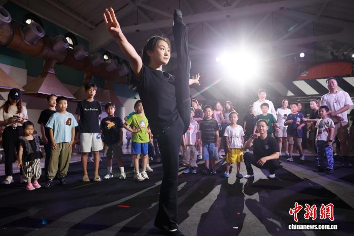 7月20日,孩子在演员的帮助下进行热身运动。当日,由杭州杂技总团演艺有限公司和上海荣誉文化传播有限公司联袂制作的中国首部沉浸式杂技《满满的豆子Full of Beans——浸入杂技》在上海市长宁区延安西路1262号上生·新所海军俱乐部上演。在整个演出中观众不仅能零距离亲近演员,还能参与互动,并亲身体验杂技的艰辛与魅力。中新社记者 殷立勤 摄